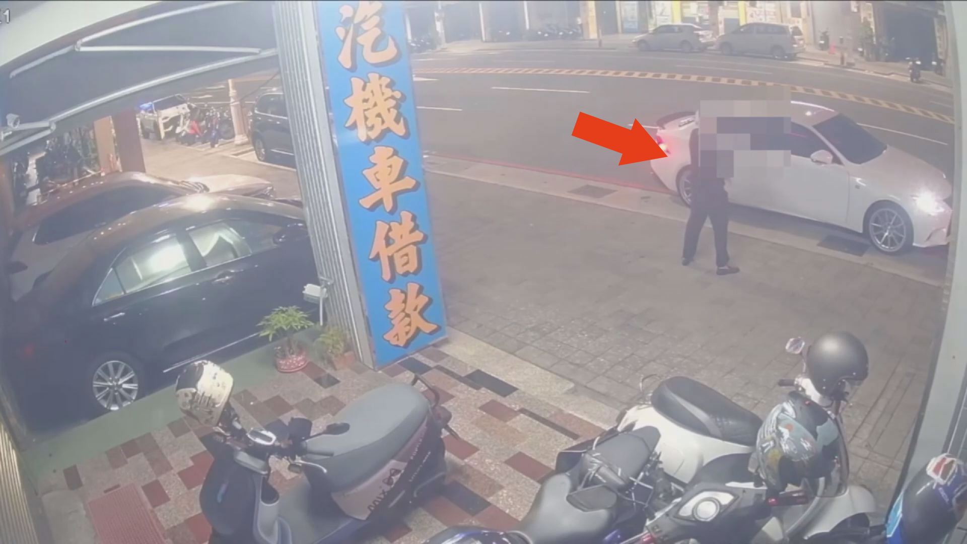監視器畫面顯示,一名男子(圖箭頭處)鬼祟在車旁徘徊觀察,發現車主熟睡,遂進入車內竊走錢包。(圖:記者李佳龍/翻攝)