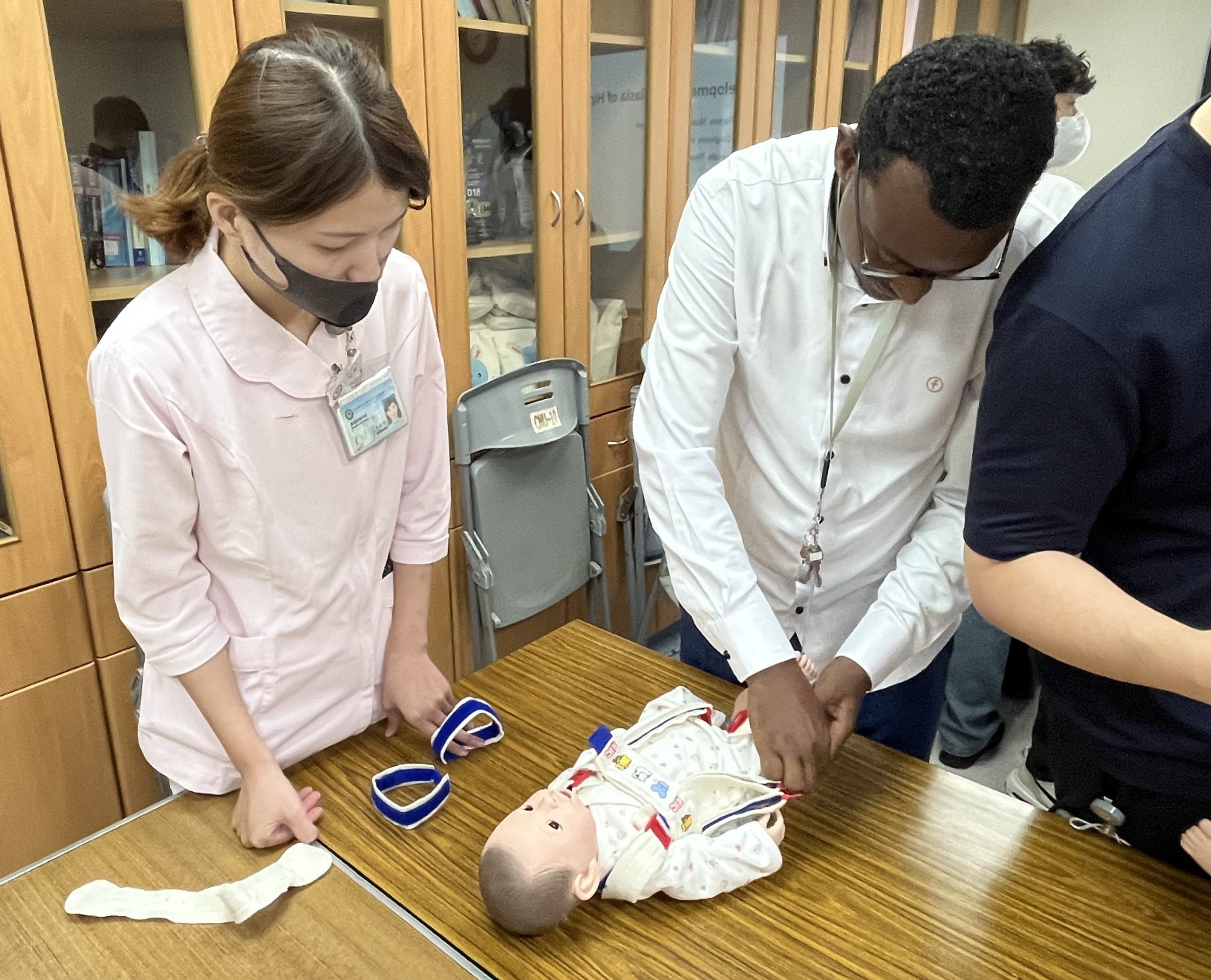 索馬利蘭2位醫師在這場由高醫新生兒科鐘浩瑋主任及陳寳如副護理長構思及安排的研討會中,由小兒骨科沈柏志醫師、杜品毅醫師教授與親自示範,再由個管師朱怡君、林希潔、鍾慧琴在旁協助指導,學習包括徒手檢查、帕氏吊帶正確穿脫、髖關節超音波判讀與實作等關鍵技能,以病例討論與臨床操作,針對「小兒髖關節發育不良」的早期診斷與治療策略,和與會學者進行專業對話,高醫小兒髖關節發育不良篩檢與照護團隊(DDH團隊)手把手指導索國學員,為的是確保技術能精準傳承,未來能有效應用於當地嬰幼兒醫療。