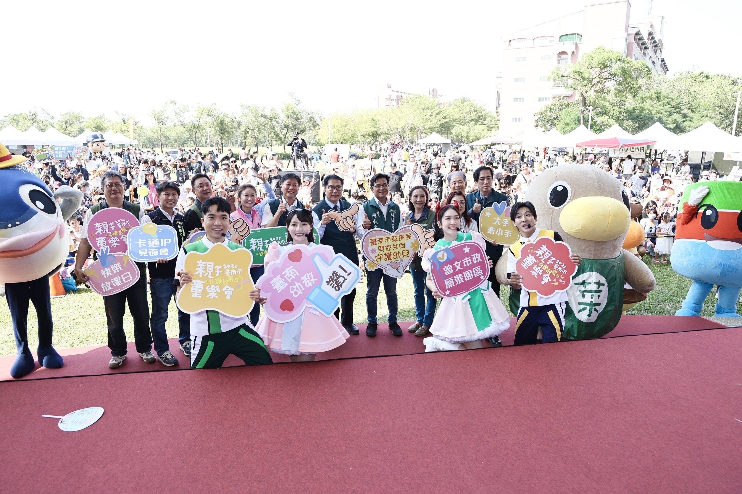 2025台南市親子童樂會今(1)日在曾文市政願景園區熱鬧登場!市長黃偉哲親自到場與大小朋友一起「快樂放電」,為活動揭開序幕。現場由YOYO家族哥哥姐姐及多位超人氣卡通明星帶來充滿活力的唱跳表演,逗得孩子們笑聲連連,也吸引約四千名親子熱情參與,共享歡樂時光。