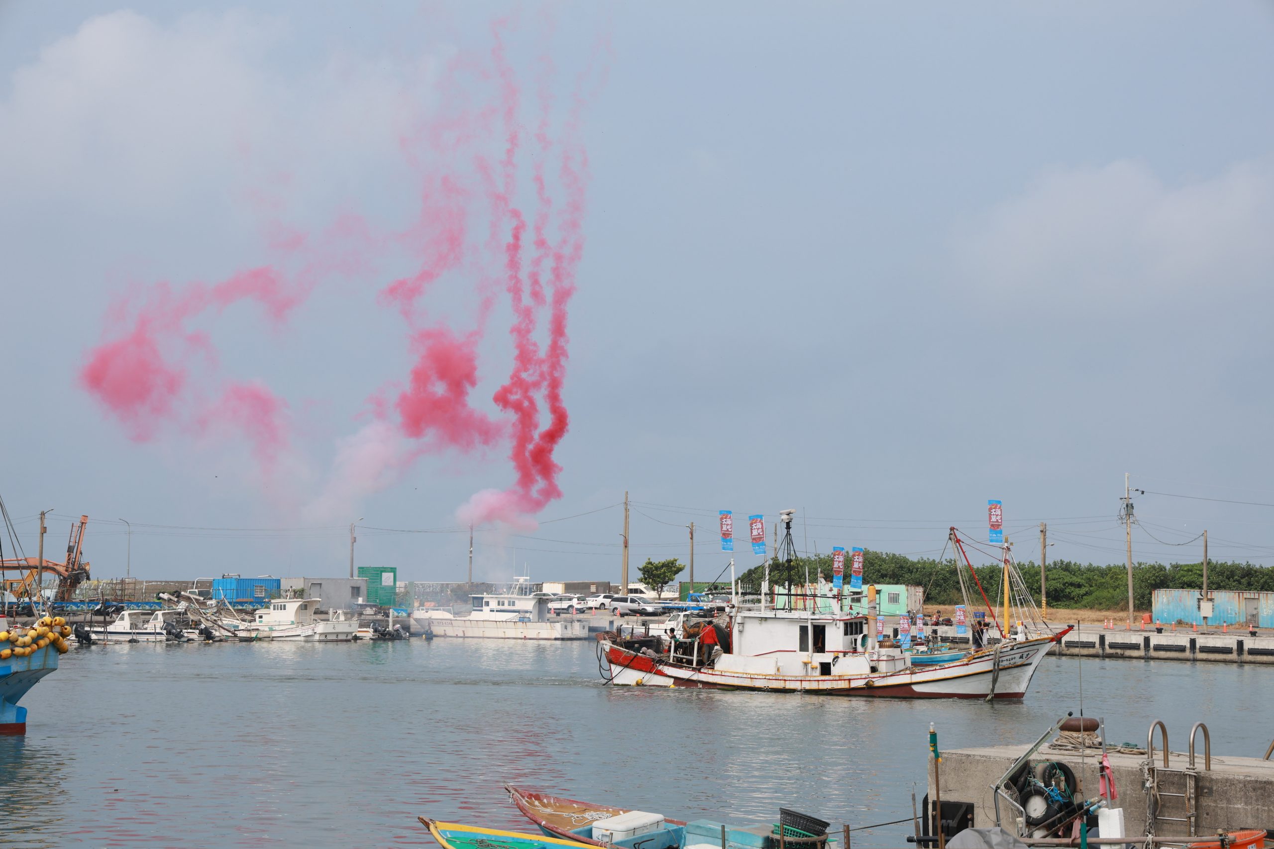 高雄「2025大海開吃」系列活動首站於彌陀開跑,陳其邁見證漁船載運虱目魚進港,船鳴與鞭炮聲響徹漁港天際,接續以「魚光滿滿,豐收滿滿」儀式為活動揭開序幕。(記者翻攝)