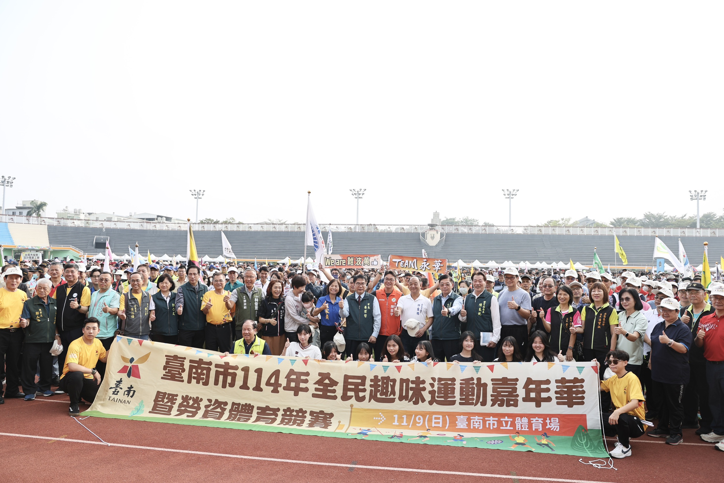台南市114年全民趣味運動嘉年華會暨勞資體育競賽今(9)日在台南市立體育場熱鬧登場,吸引來自各區的公教人員、勞資團體與長青族群熱情參與,共計143隊、3,489人齊聚一堂,透過趣味賽事互相交流,在運動中享受難得的週末時光。市長黃偉哲一早到場為選手加油打氣,祝福所有參賽者都能玩得開心、留下美好回憶。