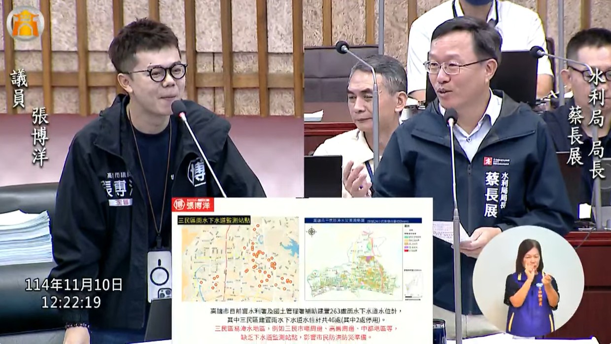 高雄市水利局局長蔡長展答詢表示,目前雨水下水道監測站屬可移動設置,若有需要會進一步調整站點位置。此外,針對數據過於抽象的問題,將研議更容易讓民眾理解的呈現方式,以提升資訊透明度。至於即時影像功能部分,水利局將向中央爭取相關經費,建置即時影像系統,提供更完善的防洪資訊。