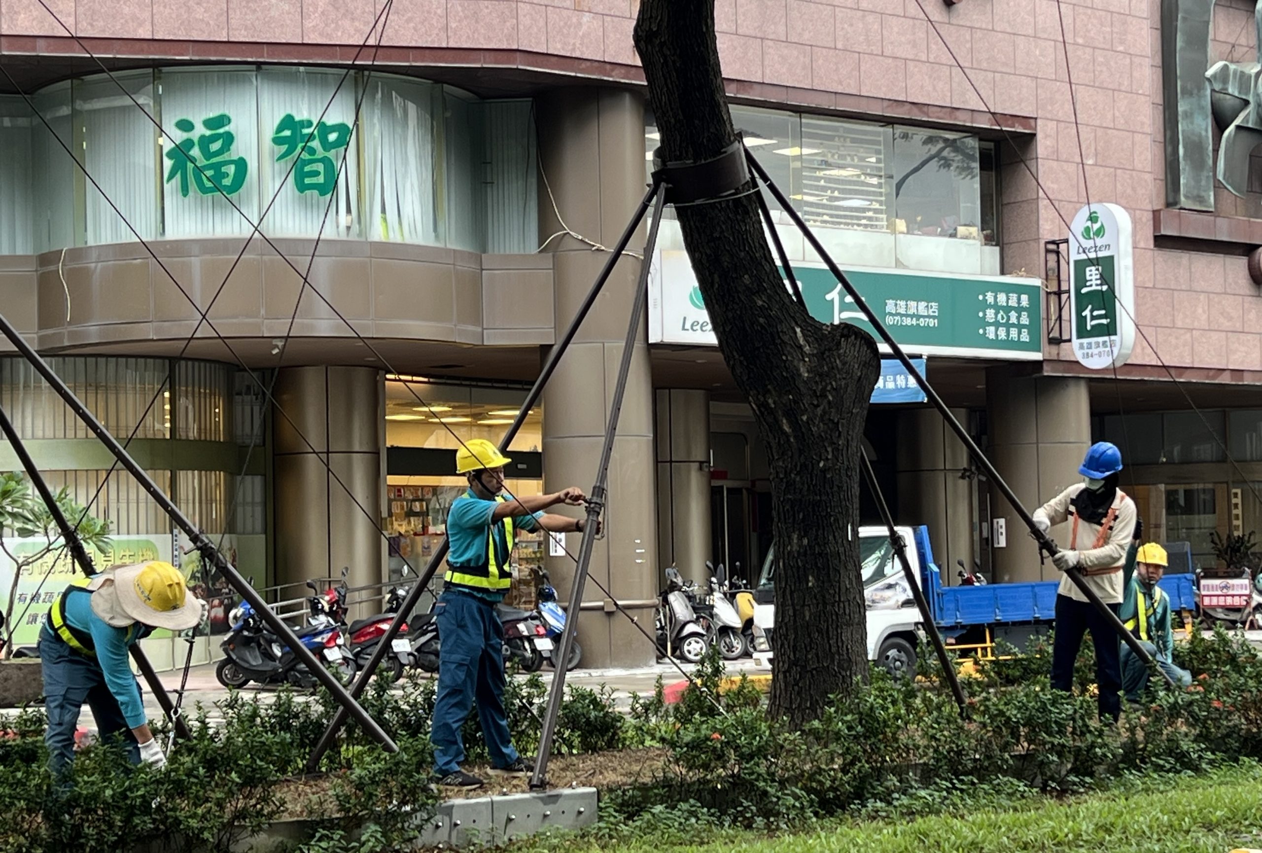 維護人員檢查加固纜繩與鋼架支撐。(記者翻攝)