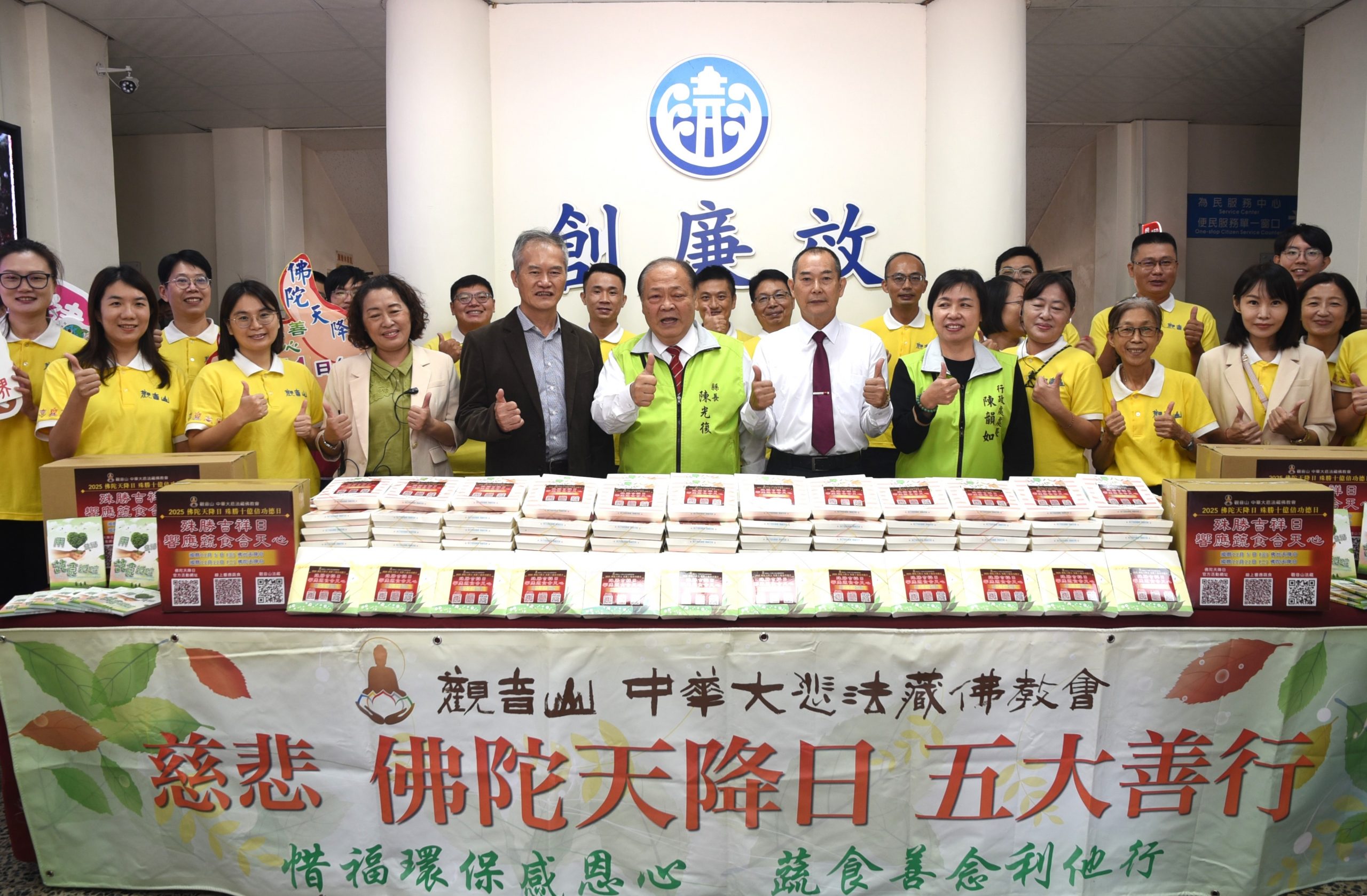 觀音山中華大悲法藏佛教會-澎湖準提佛苑14日上午準備了 668份蔬食便當致贈縣府同仁,由縣長陳光復代表接受,並回贈祝福禮。他感謝準提佛苑以實際行動推廣蔬食、環保與善念,盼望民眾能從日常飲食中落實愛地球的精神,讓善緣綿延、愛心循環,溫暖滿人間。