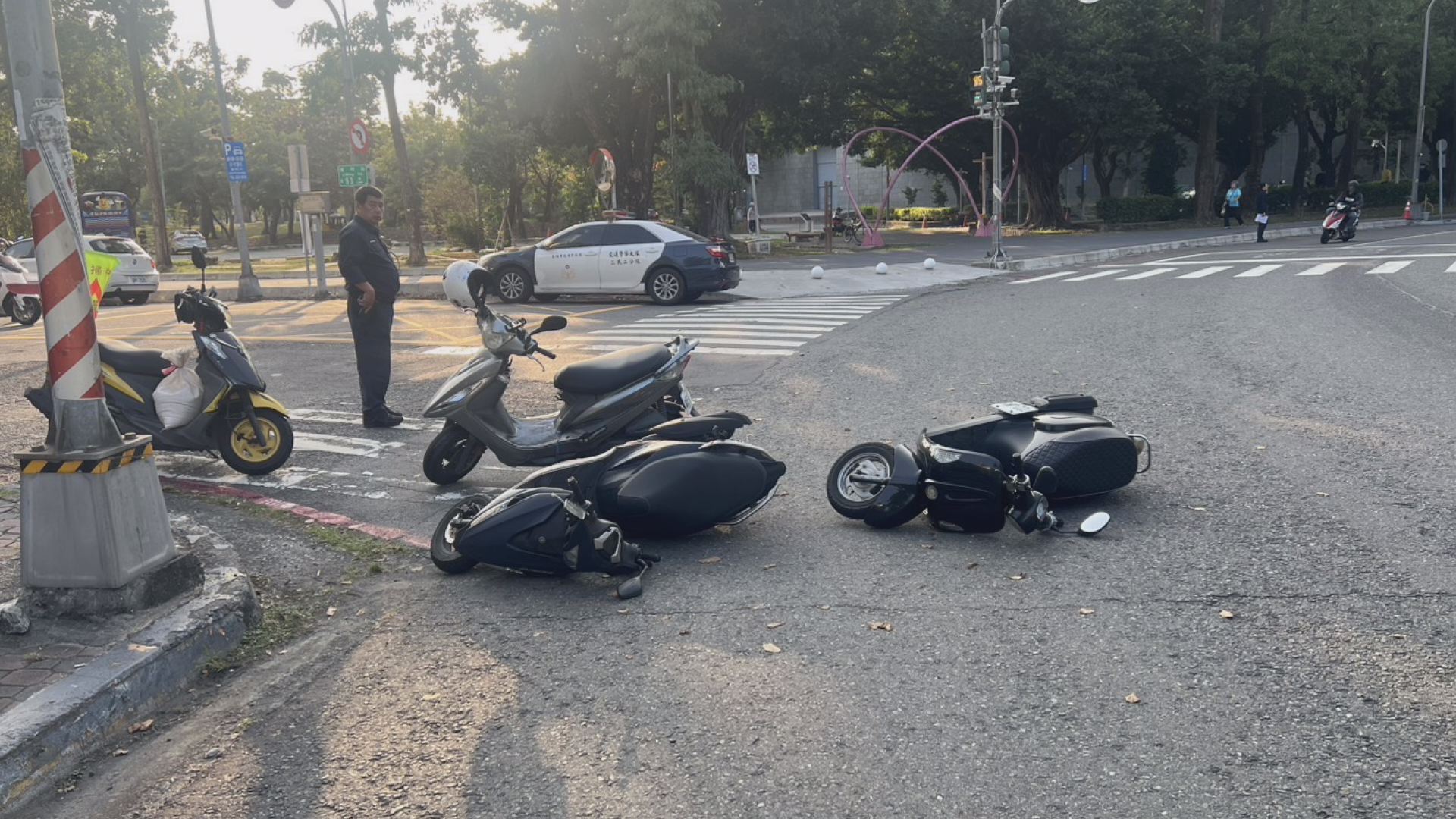 滑摔的機車騎士們皆有不同程度擦挫傷,所幸送醫後無大礙;警方已掌握涉案小貨車行蹤。 (圖:記者李佳龍/翻攝)