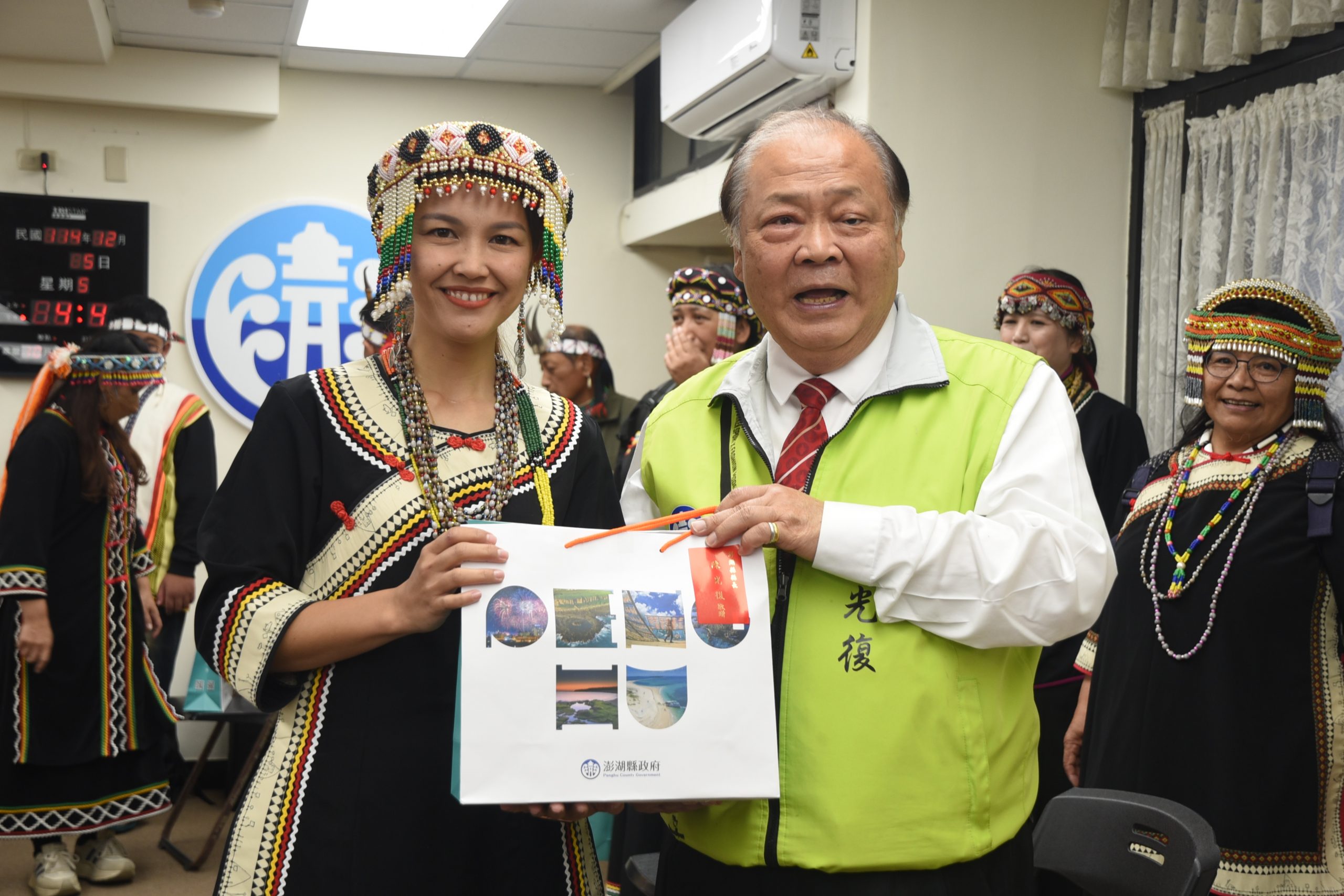 基督長老教會中布中會卡度教會偕同旅居澎湖的原住民族人,昨(5)日下午蒞臨澎湖縣政府傳唱福音,眾人身著色彩繽紛的原住民族傳統服飾,以渾厚動人的歌聲傳遞平安與祝福,現場洋溢溫暖感動的氛圍。縣長陳光復熱情迎接眾人到訪,感謝大家將信仰的愛與關懷帶到澎湖。