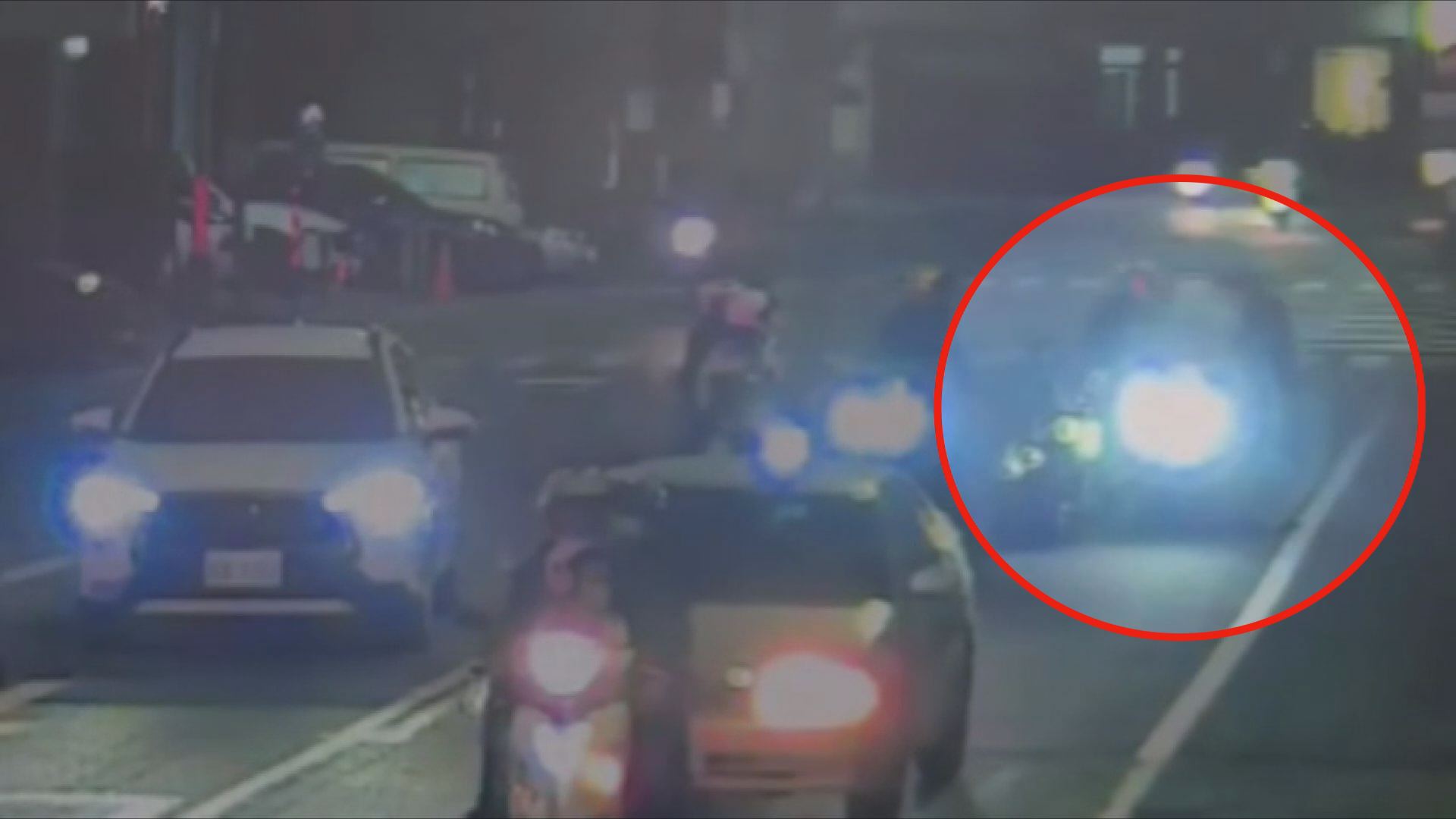 高雄鼓山區發生行車糾紛,許姓機車駕駛不滿蔡姓重機駕駛按鳴喇叭,竟無故在道路中攔停下車爭論(見紅圈處),影響交通。 (圖:記者李佳龍/翻攝)