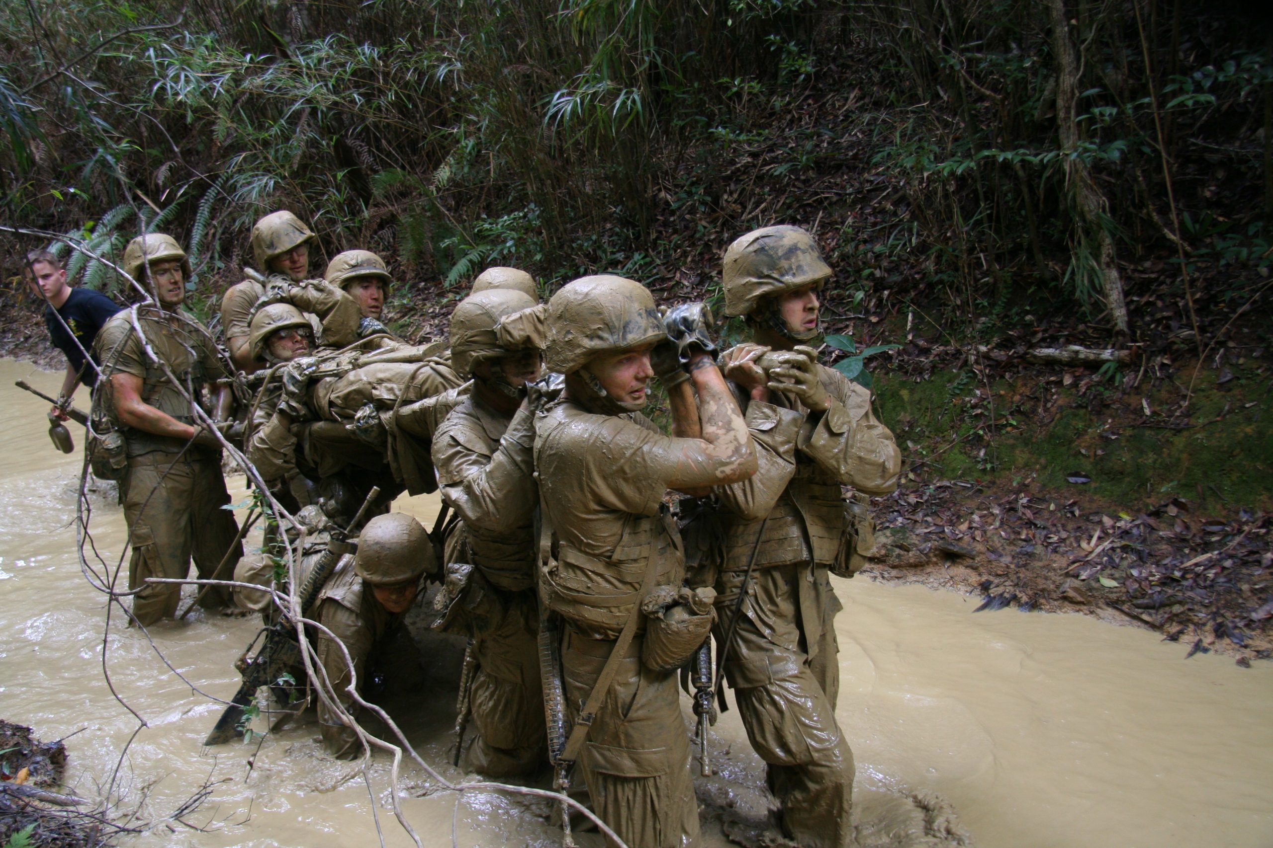 對美軍陸戰隊隊員來說,野外生存訓練是最折磨人的訓練,但也是最能考驗和展現人的毅力的訓練。“叢林作戰訓練中心”的野外生存訓練每次共12天,分爲課堂教學、野外生存和躲避3個階段。課堂教學進行3天,主要在室內講授野外吃、住、自救等方面的知識。完成了這一階段就要將課堂的知識實踐,總共5天。每個受訓隊員不帶地圖、食品和飲用水,隨身只准携帶1把軍刀、1個軍用水壺和迷彩雨衣進入陌生的訓練區。再緊接著就是躲避訓練,共4天,在這4天里,受訓隊員要時刻躲避(教官)追踪人員的追擊,一旦被活捉,就要被送進戰俘營里。進入戰俘牢房,等待的就是求生不得、求死不能的虐待。在這里,穿著同樣軍服的戰友變得如同凶神惡煞般,用針扎,用皮帶抽,用電棍打,就是爲了考驗陸戰隊員寧死不屈的意志。在12天的野外生存訓練過程中,爲了維持體力,美軍陸戰隊員必須捕食蛇蟲充饑,挖掘植物根莖解渴。經過12天後,平均每人要减去8斤肉。