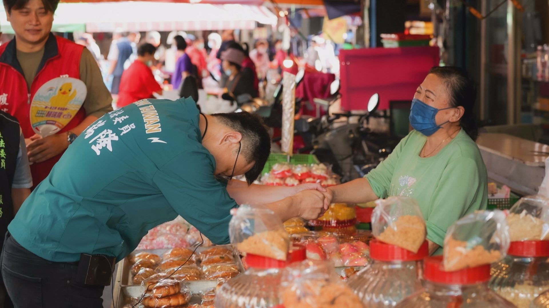 立委賴瑞隆(圖左))彎腰向市場攤商致意握手,展現謙卑與踏實走基層的態度。(圖:記者李佳龍/翻攝)
