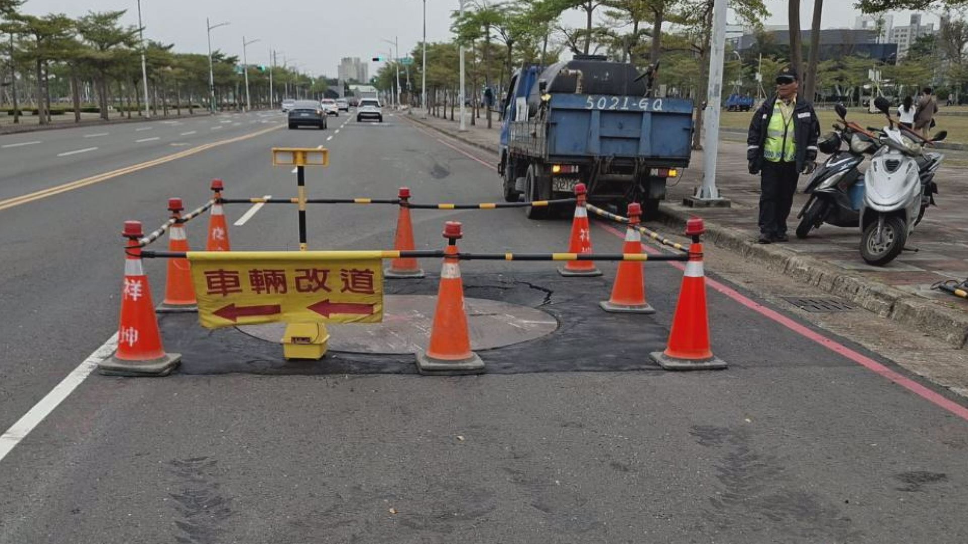 警方確認該處人孔蓋權責單位為水利局後,同步通報 1999 專線並由相關單位派工進行緊急修復,以確保後續用路人之行車安全。 (圖:記者李佳龍/翻攝)