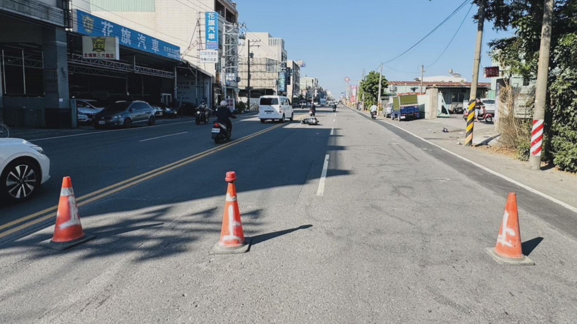 大寮區鳳林三路發生嚴重連環事故,貨車先與同向機車擦撞(圖),造成39歲陳姓女騎士重傷,送醫後不治,現場散落大量車體零件與破碎雜物。 (圖:記者李佳龍/