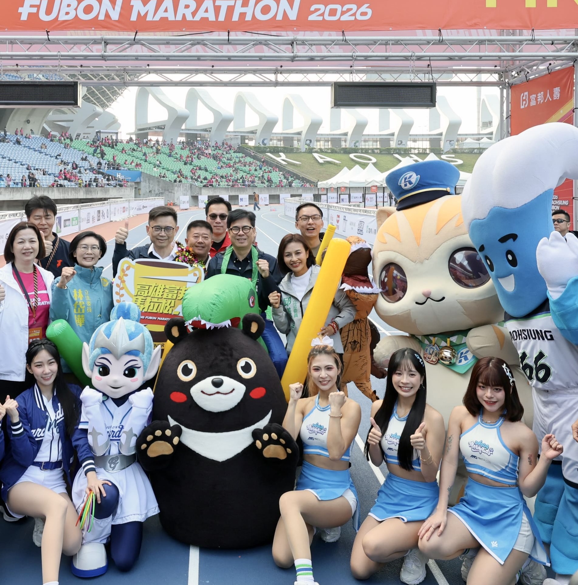 2026高雄富邦馬拉松於1月10日(六)、11日(日)在高雄國家體育場盛大登場,本屆賽事路線首度向北延伸,串聯橋頭、梓官、岡山、彌陀等行政區。活動首日由5公里休閒組於上午7時30分率先起跑;備受矚目的「最速恐龍爭霸賽」集結204隻大小恐龍報名參賽,參賽者穿著各式恐龍造型服裝在田徑場上衝刺,畫面逗趣又熱血。同時首度舉辦的「吉祥物啦啦隊接力賽」集結高雄熊、蜜柑站長、海神布浪尼、富邦Bonnie及義大的大義與唐基等人氣吉祥物,並攜手Fubon Angels與海神啦啦隊女孩同場互動,成功炒熱現場氣氛。