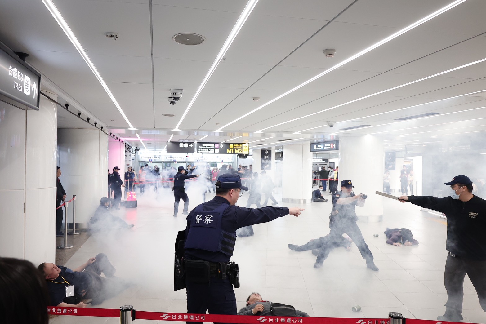 台北車站1月22日下午舉行無差別攻擊為安演練,模擬多名歹徒在台鐵月台丟擲煙霧彈後,與地下3樓共構區內無差別攻擊民眾的為危安演練。(台北市政府提供)