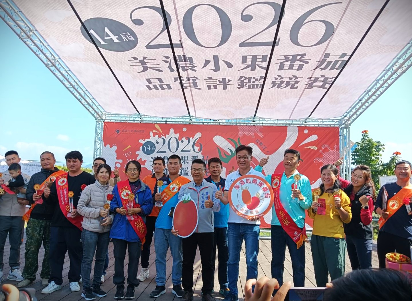 【記者劉昱彣高雄報導】美濃農會23日於美濃客家文物館前舉辦2026年第十四屆美濃小果番茄品質評鑑競賽決賽,橙蜜香番茄組冠軍宋國智、亞軍鍾永宣、季軍黃偉辰,優勝有黃吳玉平、蕭飛龍、蕭成龍、鄭美鈴、吳錦尚、陳品彤等6人,其他小果番茄組冠軍陳品彤、亞軍張治紘、季軍吳錦尚,優勝有李文忠、鍾永宣、鍾介升、鄭美鈴、林作賢、曾毅平、劉享亮等7人。