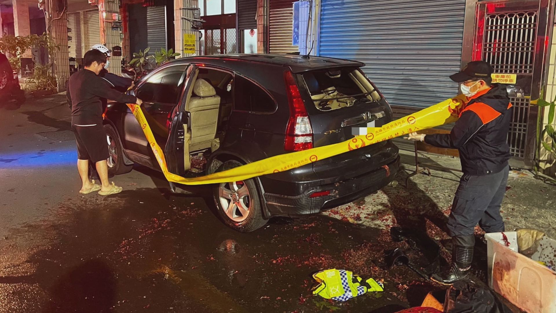 受損車輛後擋風玻璃嚴重破裂,地面殘留大量鞭炮施放後的紅色碎屑與餘熱。警方獲報後