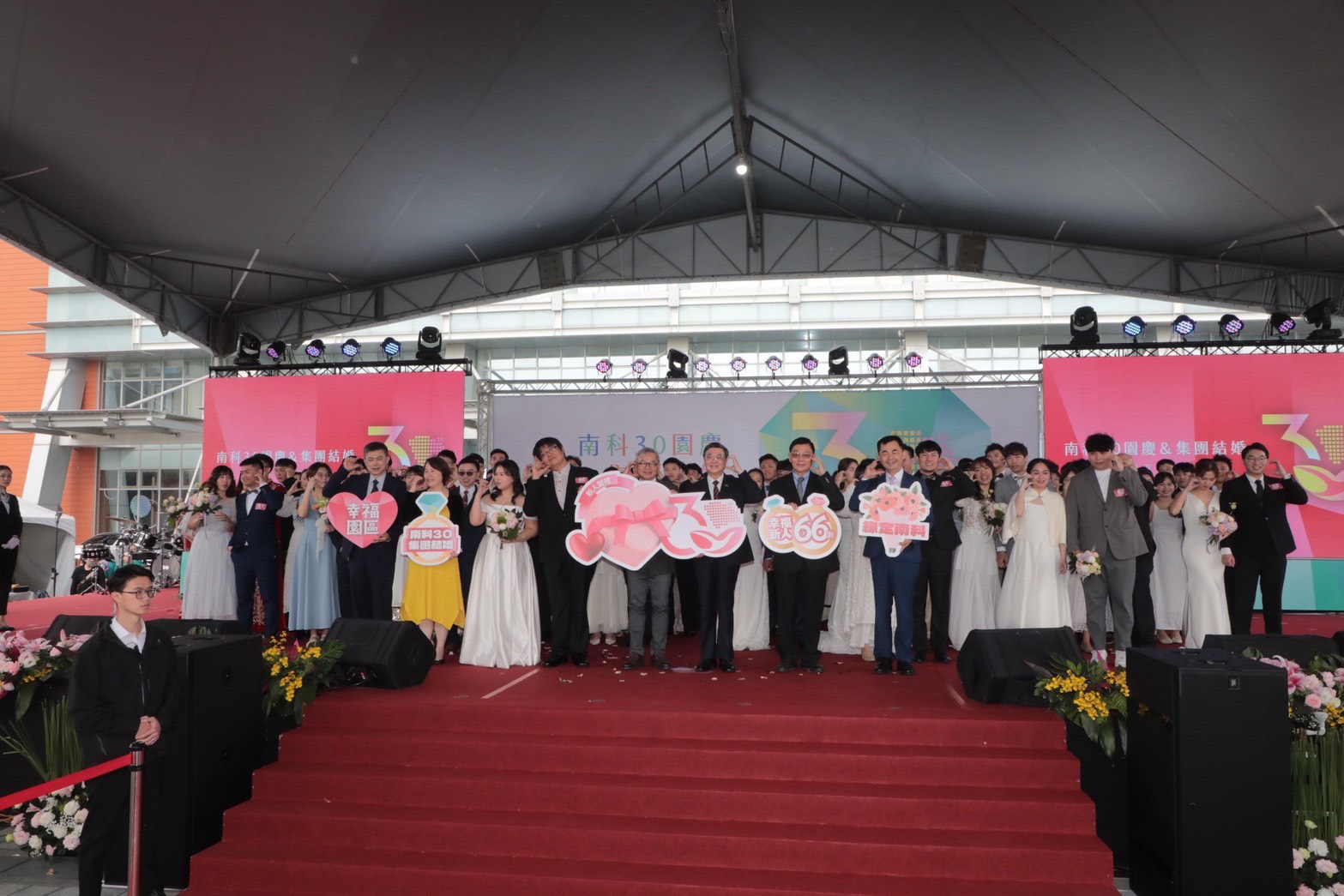 卓院長說,很高興在南科30週年之時,見證66對新人集團結婚,完成人生一個重要里程碑,象徵南科不僅孕育高科技產業,也是孕育幸福的所在。他指出,政府將經濟成長成果回饋全民,持續推動「0到6歲國家一起養」政策,今年相關預算編列達1,136億元,透過托育補助與公共資源挹注,減輕年輕家庭負擔,讓願意生、養得起,成為支持少子化對策與世代永續的重要基礎。最後,他祝福新人以經營園區的精神經營家庭,幸福長久。