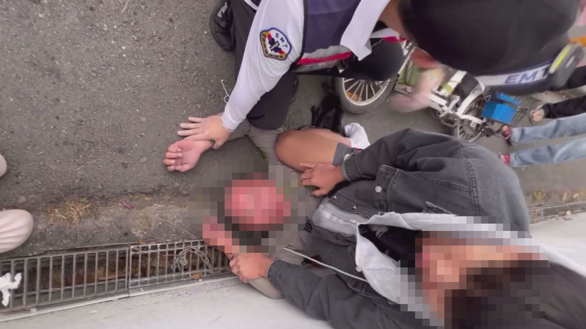 簡姓大學生在勸阻過程中與馬男發生肢體拉扯,即便自身多處擦挫傷,仍奮力將失控的馬男壓制在地,直到警消人員趕抵現場接手處置。(圖:翻攝自網路Threads)