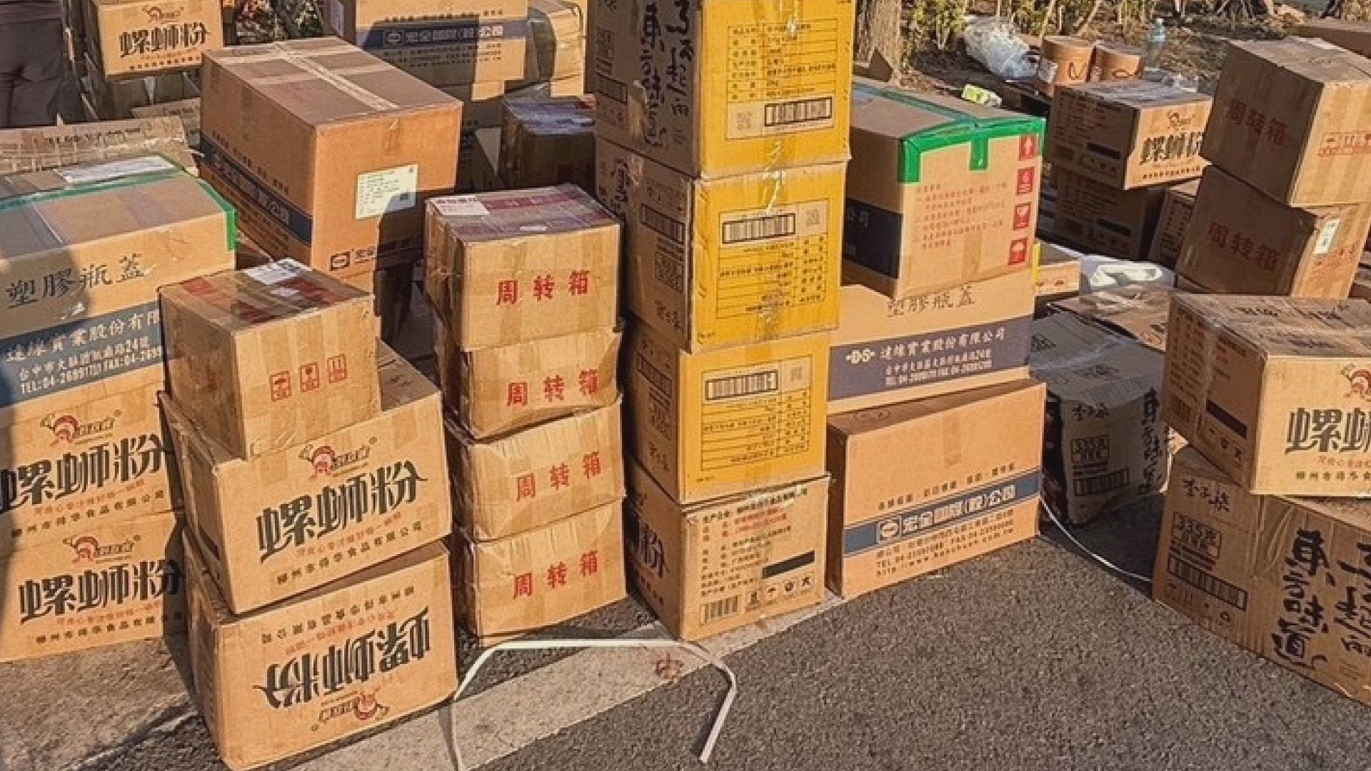 除香菇外,現場亦清點出螺螄粉、醬料、堅果及各式乾貨等大陸食品近 1,987 公斤,整體走私規模相當驚人。 (圖:記者李佳龍/翻攝)