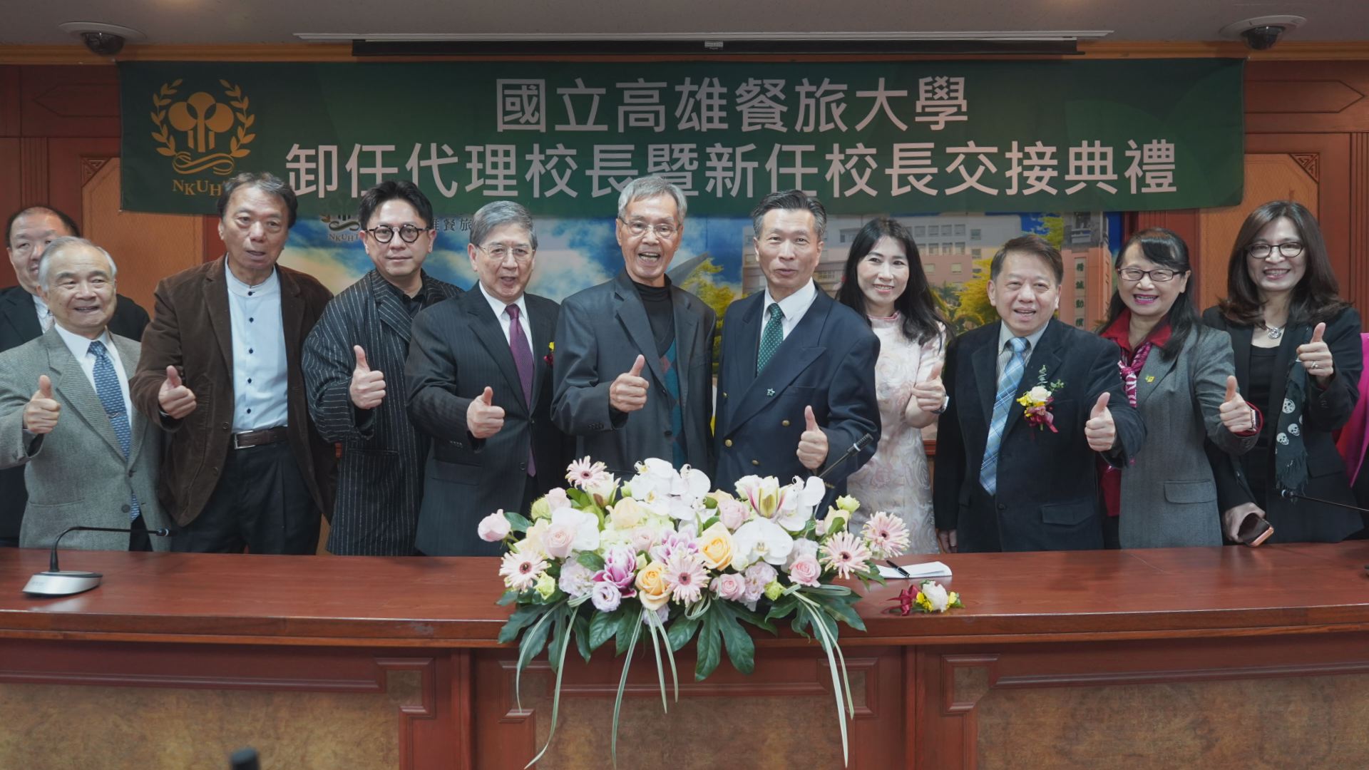 在前任校長容繼業、陳敦基見證下,方德隆從代理校長陳國泰手中接下印信,完成象徵傳承的重要時刻。巧合的是,陳國泰正是方德隆博士班指導學生,師生交棒也為校史寫下佳話。方德隆校長表示,未來將帶領高餐大持續邁向國際化,並把永續發展目標納入教學核心,推動綠色餐旅、低碳營運與永續創新,期許高餐大不僅是臺灣唯一的國立餐旅大學,更能站上亞洲、走向世界,成為具國際影響力的餐旅教育重鎮。