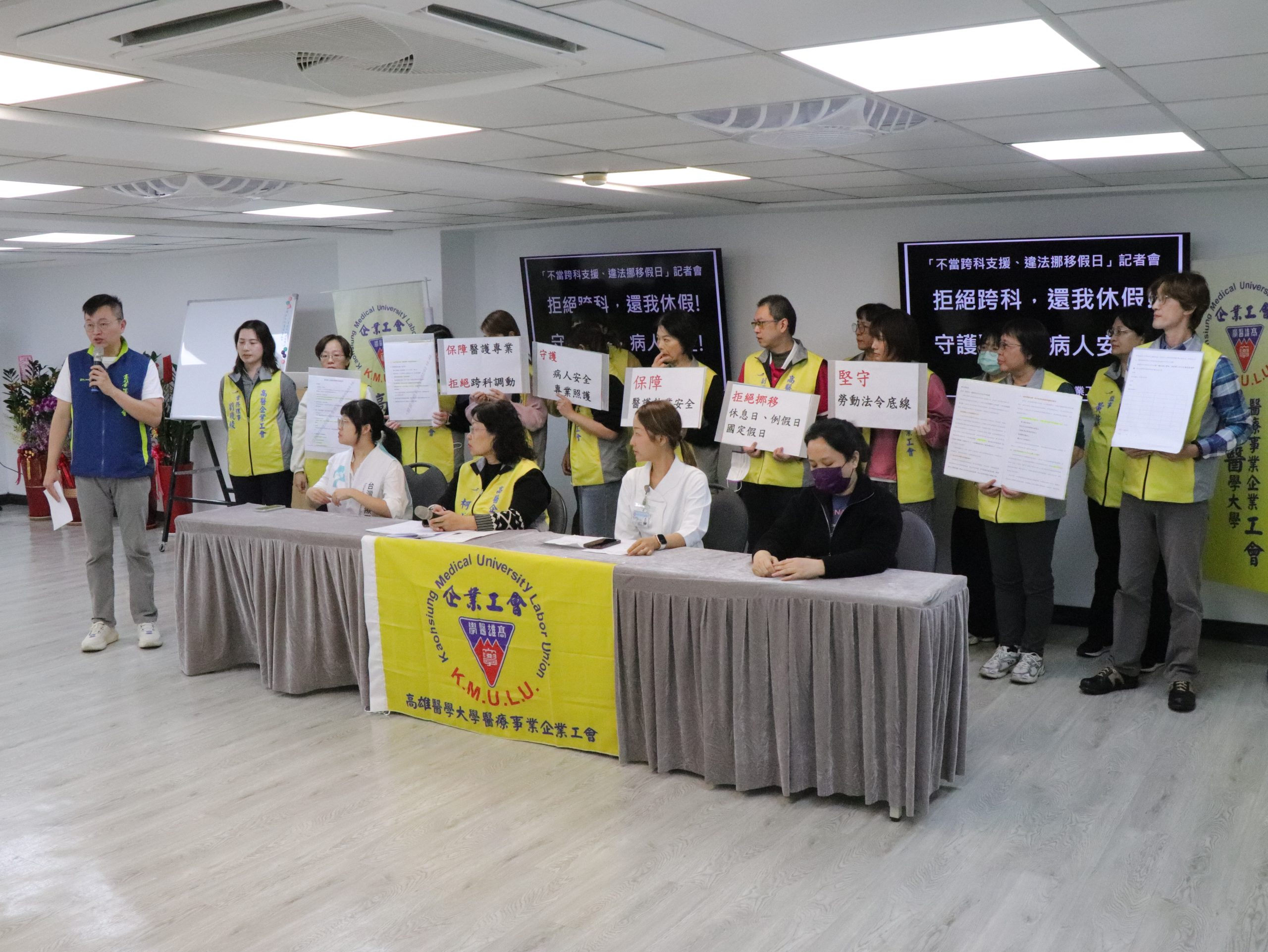 【記者陳春生/高雄報導】高雄醫學大學醫療企業工會今(9)日召開記者會,嚴正反對高醫院方在長期人力不足未改善的情況下,強推護理人員進行「跨科支援」,並要求挪移、調整國定假日作為工作日。工會痛批,此舉罔顧病人安全與醫護人員勞動權益,形同要求「骨科代診婦科」、「卡車駕駛支援開客運」,已嚴重違反醫療專業分工原則。工會說明:護理師本就會依據在醫院的各科別所需專業與訓練進行「分科」,如手術房、急診室、內科、外科、兒科等,不同科別護理師皆有其自獨立的專業訓練與技能。這乃是為了確保醫療品質與病人安全及權益的重要且必要的制度。然而,高醫長期以人力不足、調度困難為由,強推護理師「跨科支援」。高醫工會嚴正反對未經充分溝通與未經完整專業訓練,即恣意將護理人員跨科調動支援帶組「常態化」。醫療工作具高度專業分工,任意調動不僅增加工作風險,也讓員工承擔超出原本職責的壓力與責任,犧牲病人安全、勞工權益來填補制度性人力不足。此外,工會也補充:國定假日、休息日與例假日等為《勞動基準法》明確保障之休假權利,不應被任意挪移、調整或以其他名目變相剝奪,假日彈性化將使醫護人員難以獲得真正休息,沒有休息的醫療,只會換來更多醫療事故。
