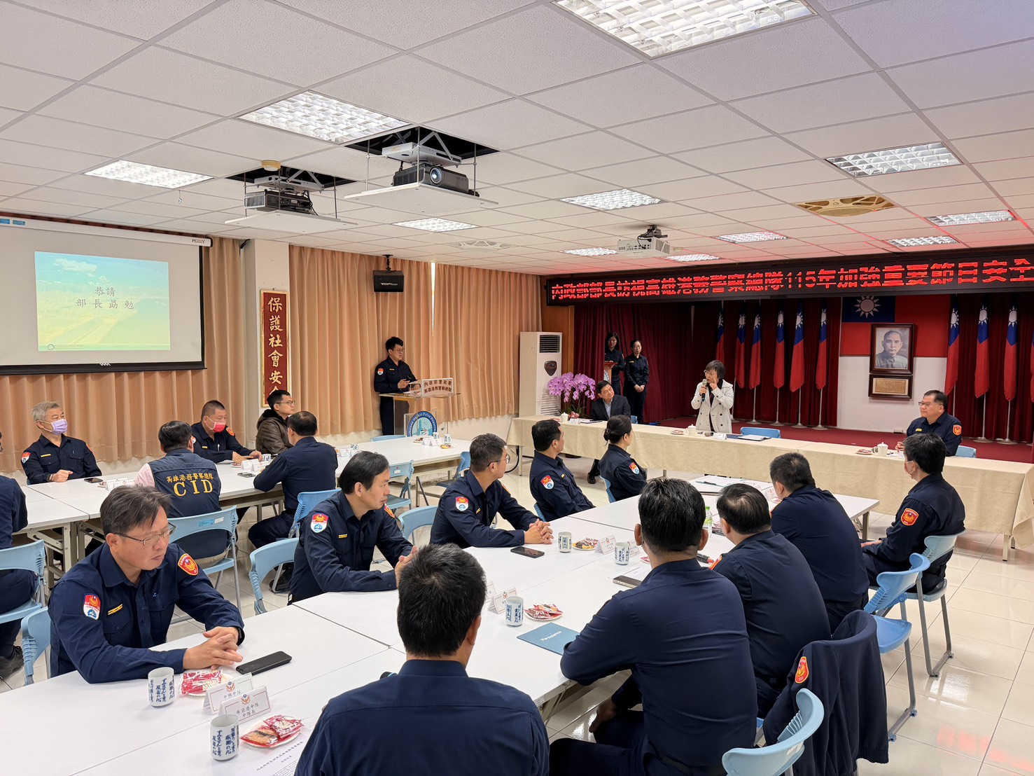 部長劉世芳指出,高雄港近年隨經濟發展、觀光產業成長及高科技產業運輸需求增加,加上亞洲新灣區推動、國際郵輪靠泊與冬日遊樂園等大型活動頻繁舉辦,港區人流與運輸量持續攀升,且高雄港務警察總隊轄區涵蓋高雄、安平、嘉義、澎湖及金門等多處商港,整體勤務負荷日益繁重,應妥適規劃各項勤務部署,確保港區秩序與安全。