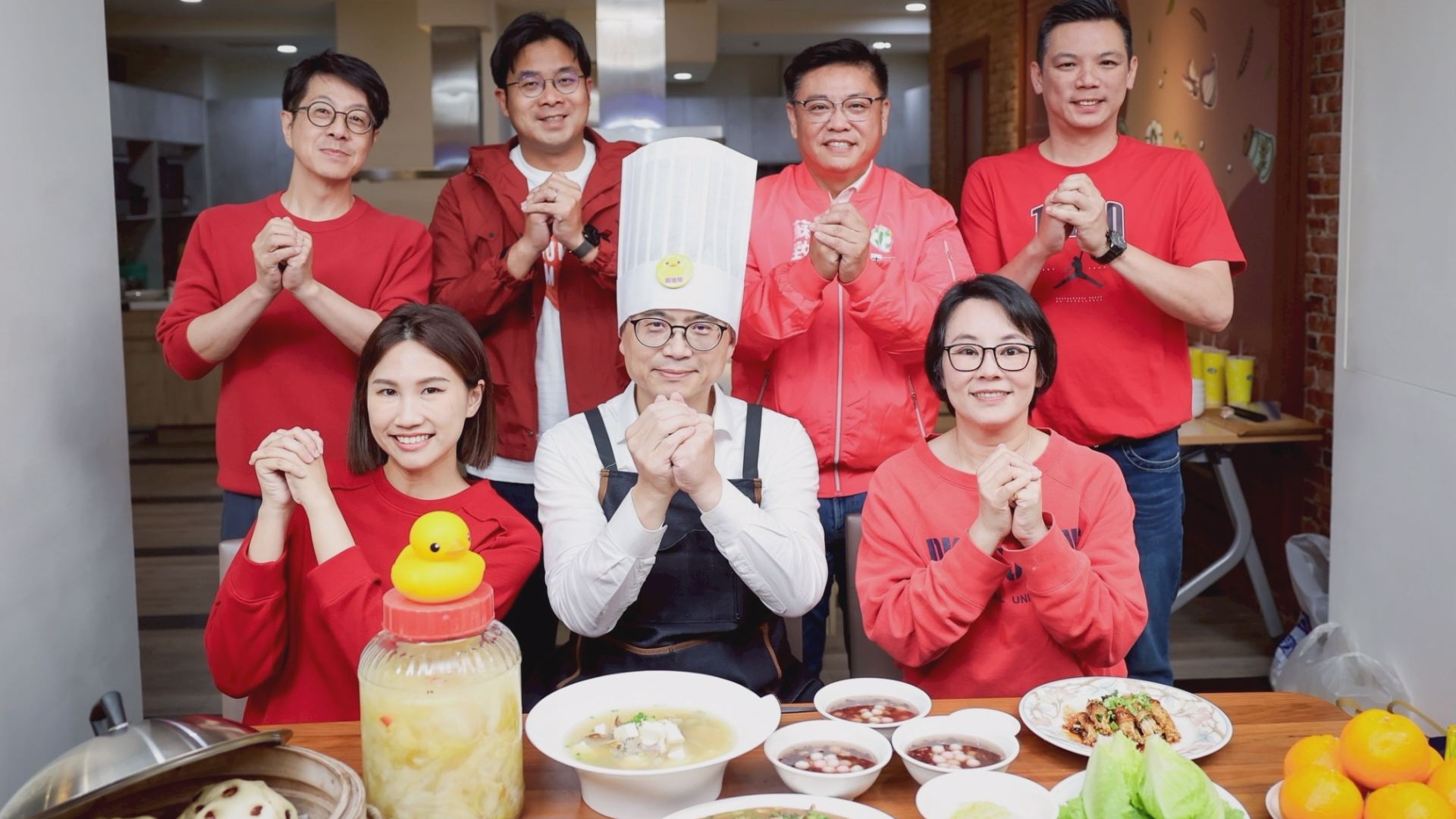 民進黨高雄市長參選人、立委賴瑞隆(前排中),化身為主廚,帶領多位市議員參選人共同現身。透過溫馨的圍爐意象,展現對未來市政端出絕好菜色以及「母雞帶小雞」的團結氣勢。(圖:記者李佳龍/翻攝)