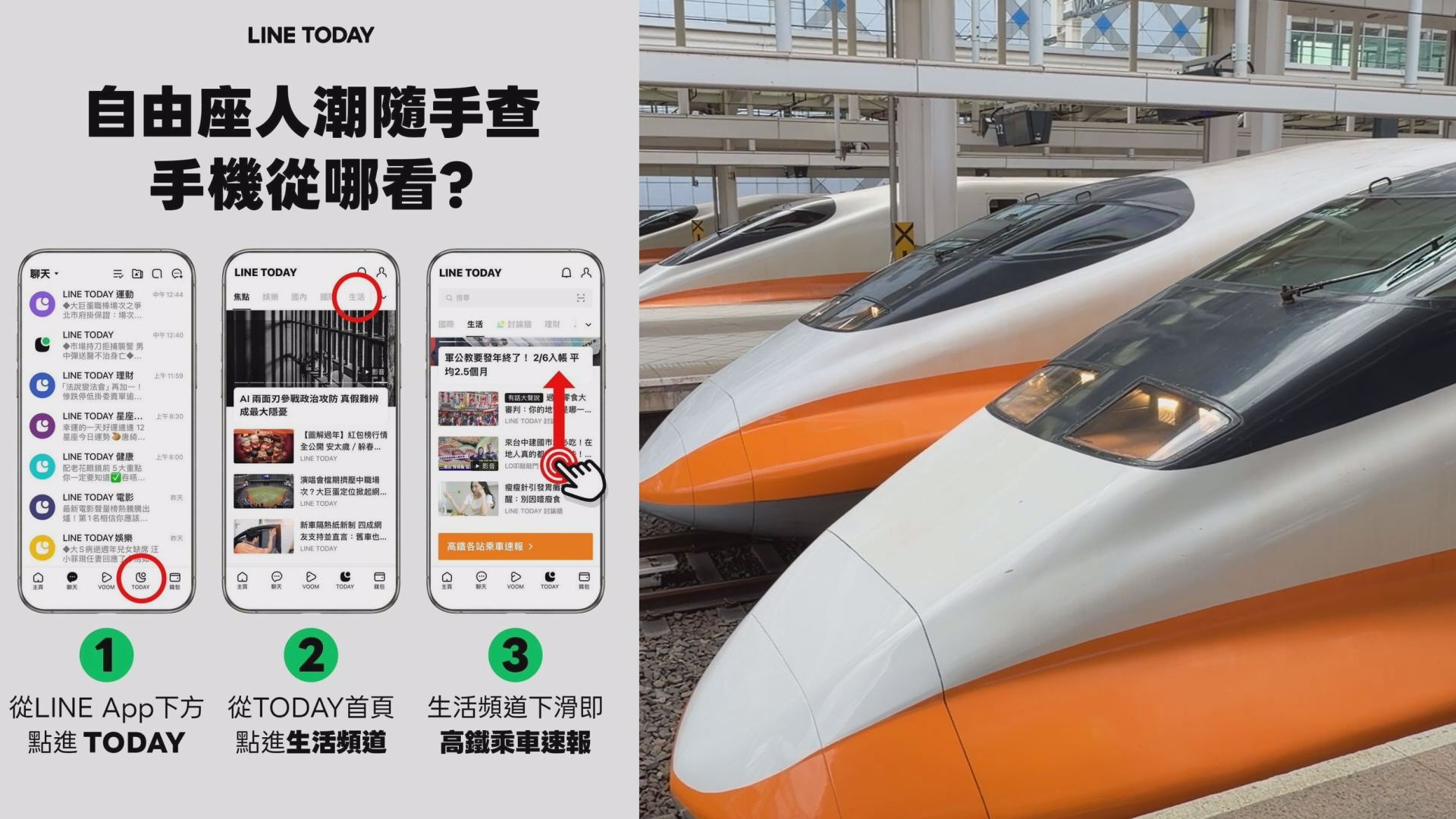 旅客可透過 LINE TODAY 四步驟簡單操作,快速查詢高鐵各站自由座即時人潮。(圖:高鐵提供。記者 李佳龍)