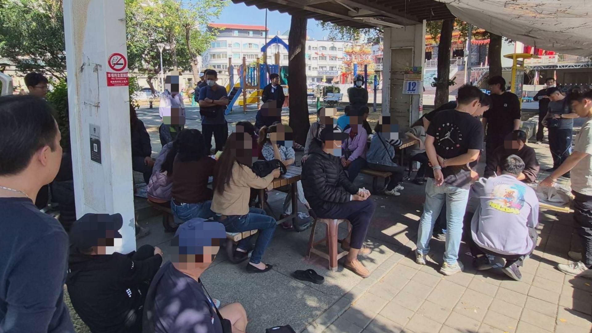 警方接獲民眾檢舉,於2月11日下午出動警力,包圍位於福民街公園內的遮雨棚賭場。原本熙攘的聚賭現場在警方現身後,氣稅瞬間凝結。(圖:記者李佳龍/翻攝)