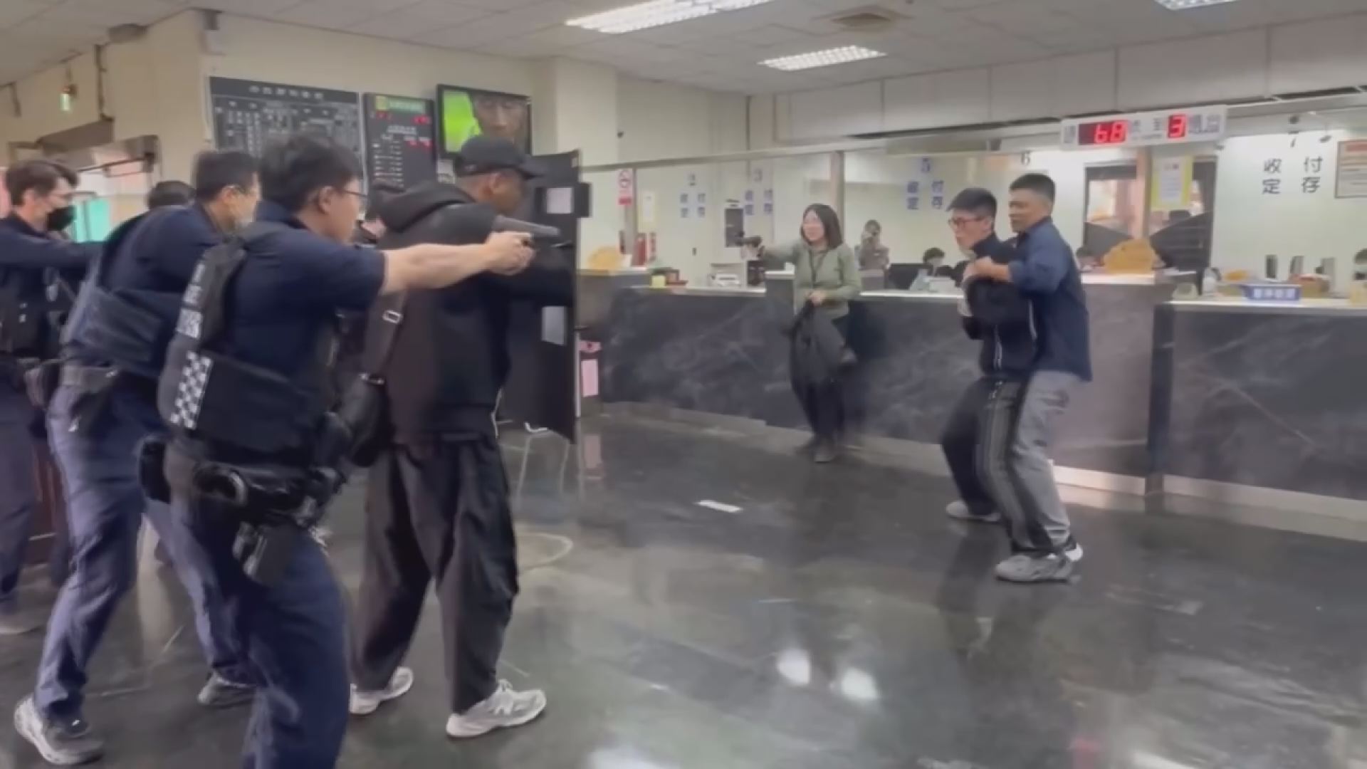 演練模擬歹徒假借洽公名義進入農會營業廳,隨即亮出槍枝威脅櫃檯行員交付現金,情勢一度相當緊張。(圖:記者李佳龍/翻攝)
