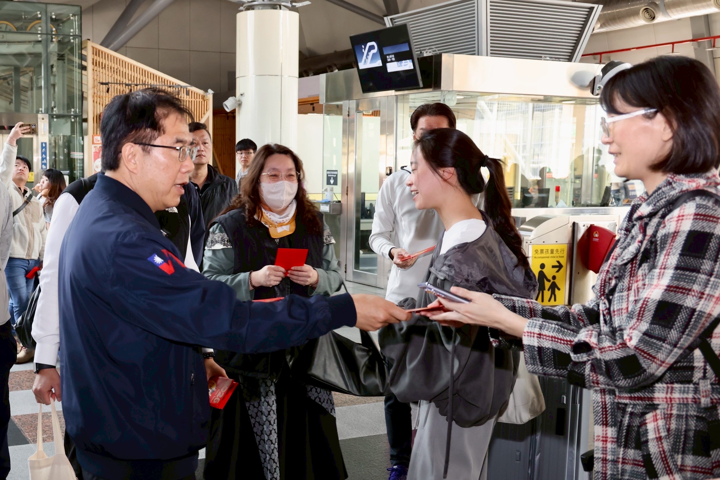 圖說-台南市長黃偉哲今(14)日上午先後前往高鐵台南站及台鐵視察旅運情形,並向返鄉市民及旅客發送「金馬伍吉」春聯與紅包