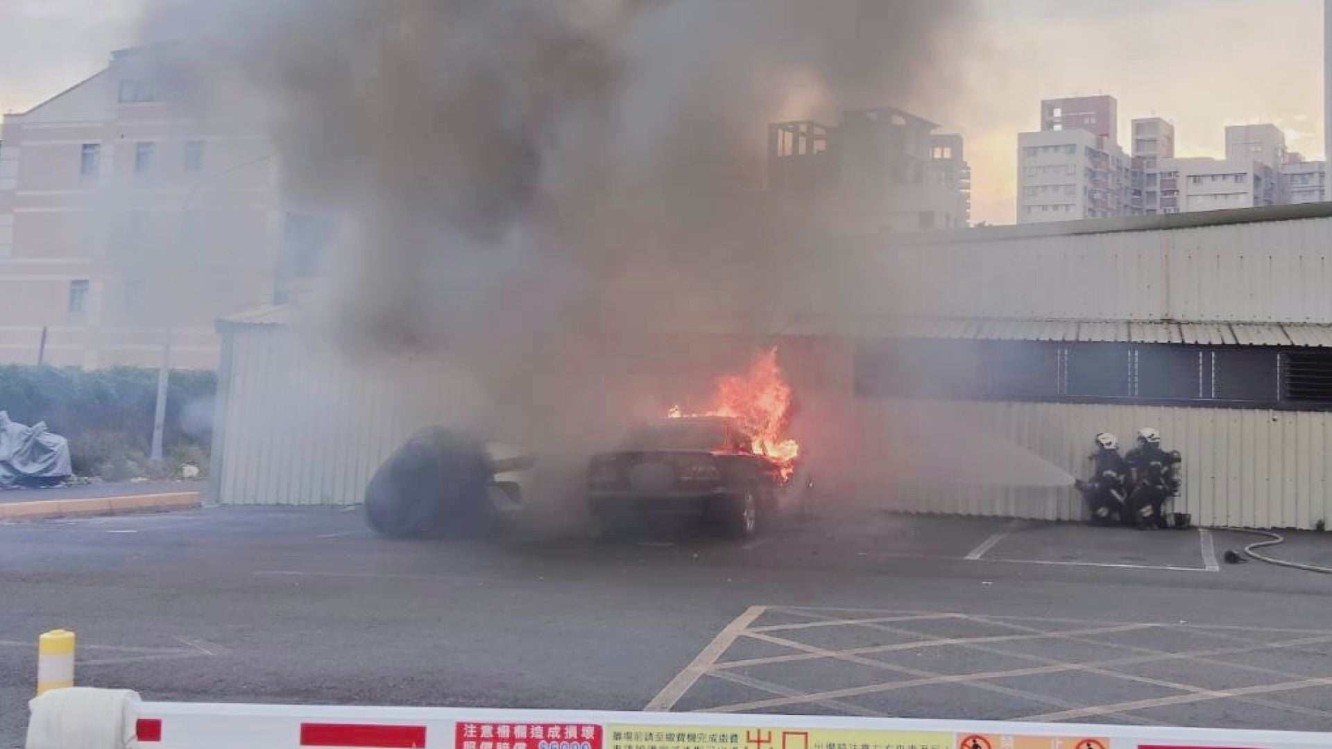 高雄左營重美街一處停車場清晨傳出火警,消防隊員獲報後迅速架設水線灌救,現場濃煙蔽天,火舌正從車輛內部竄出。(圖:記者李佳龍/翻攝)