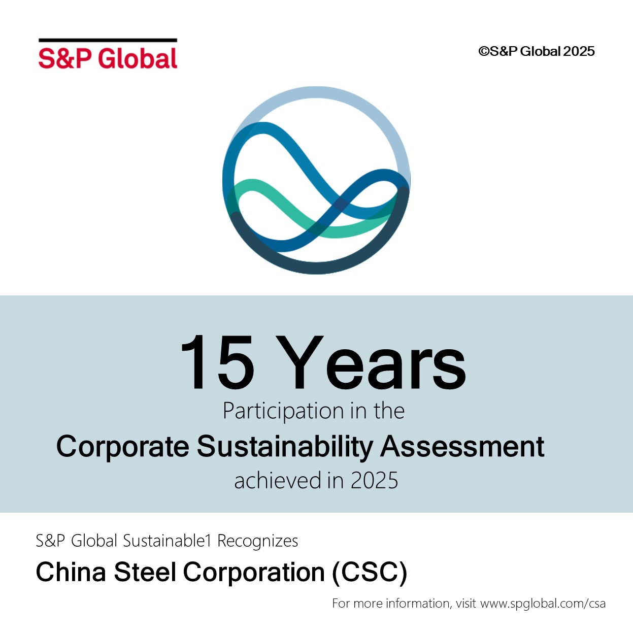 中鋼永續經營的決心及資訊透明度不僅深獲國際公正機構的高度肯定,中鋼也因為參與CSA評比長達15年,S&P Global特別頒予《參與S&P Global CSA 15週年》紀念徽章,象徵著中鋼在永續發展領域上,展現努力不懈的企業精神。面對近年來鋼鐵市場景氣循環變動劇烈、地緣競爭及碳定價、碳關稅與碳中和等三碳挑戰,中鋼已全面啟動永續治理及行動方案,將持續深化ESG工作,攜手用鋼產業夥伴,共同在全球競爭下升級轉型,朝永續經營目標前進。